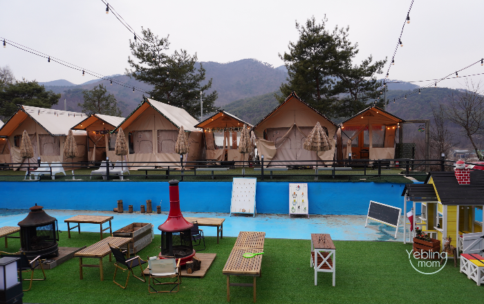 수영장을 둘러서 글램핑이 배치되어 있어요.