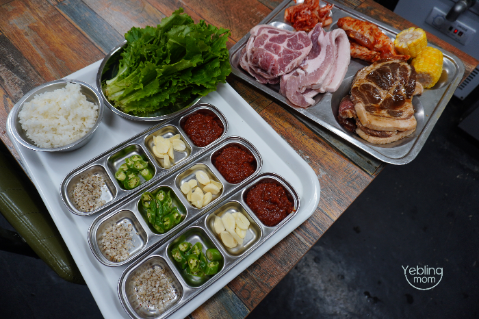 김치, 상추, 쌈장, 마늘, 고추, 쌀밥 등등 모두 준비해 주시구요.