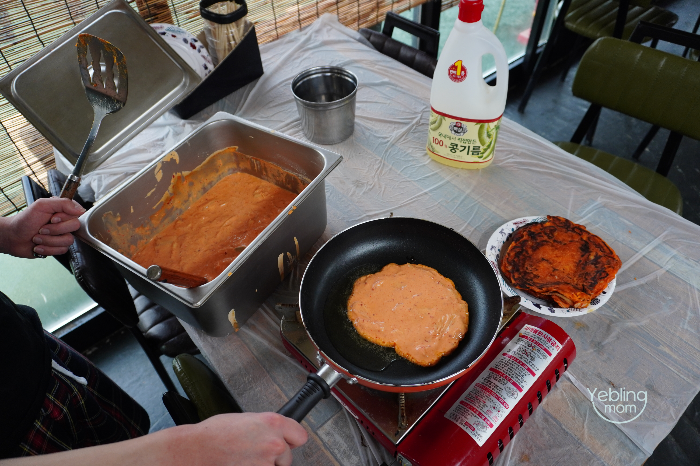 대신- 김치전은 반죽을 가지고 이동 할 수는 없고,