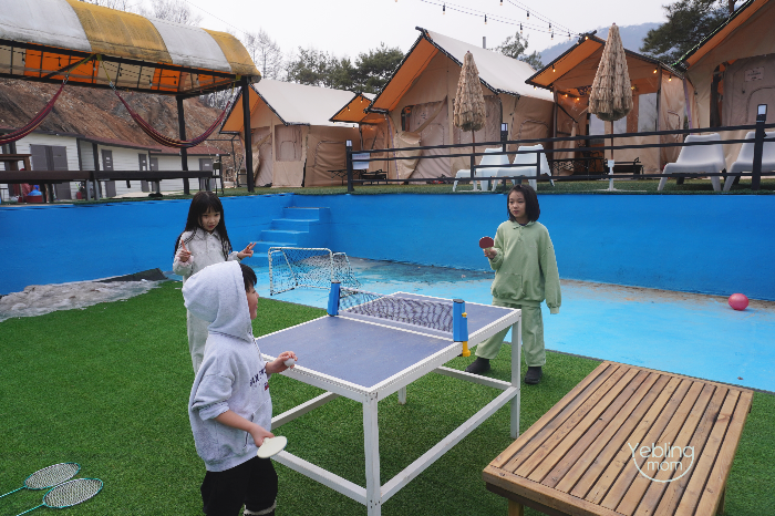 ( 위쪽에 일반 글램핑은 수영장은 가까운데 글램핑 안 쪽에 화장실이나 싱크가 없어서 공용을 사용해야 하는거 같아요.
